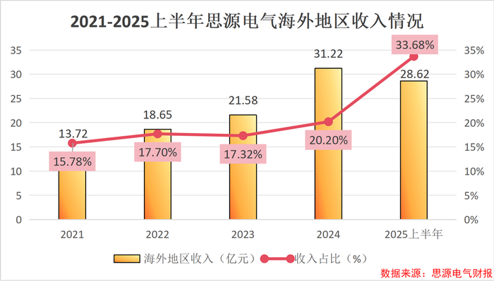 2021到2025年上半年,思源电气海外地区收入占比不断提升。2025年上半年,公司海外地区收入达到28.62亿元,同比增加89%,收入占比达到33.68%,创下历史新高。