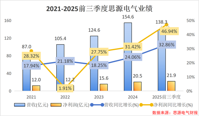 2025年前三季度,思源电气营收和净利润分别为138.3亿元和21.9亿元,同比分别增长32.86%和46.94%。