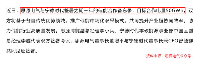 12月25日,思源电气与宁德时代签署了为期三年的储能合作备忘录,目标合作电量50GWh。