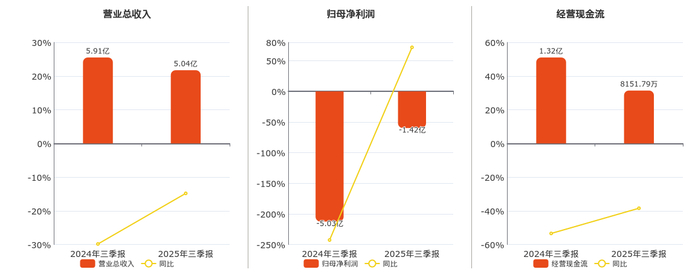 公司营业总收入为5.04亿元。归母净利润为-1.42亿元,较去年同报告期归母净利润增加3.61亿元。经营活动现金净流入为8151.79万元。