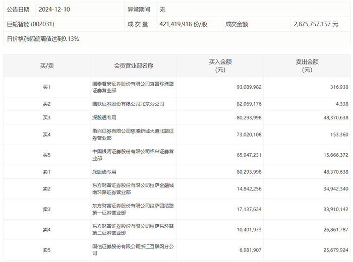 巨轮智能今日涨停,龙虎榜数据显示,上榜营业部席位全天成交6.3亿元,占当日总成交金额比例为21.9%。其中,买入金额为4.44亿元,卖出金额为1.86亿元,合计净买入2.58亿元。