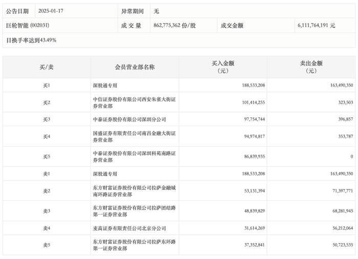 1月17日,巨轮智能今日涨停,龙虎榜数据显示,上榜营业部席位全天成交11.52亿元,占当日总成交金额比例为18.84%。其中,买入金额为7.4亿元,卖出金额为4.11亿元,合计净买入3.29亿元。