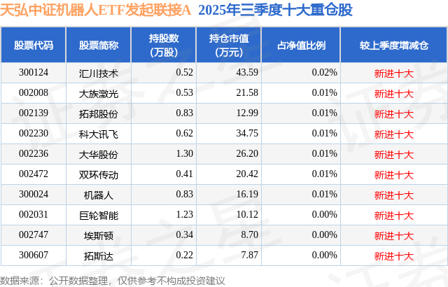 根据2025基金Q3季报公募基金重仓股数据,重仓该股的公募基金共1家,其中持有数量最多的公募基金为天弘基金的天弘中证机器人ETF发起联接A。天弘中证机器人ETF发起联接A目前规模为5.09亿元,最新净值1.2222(1月7日),较上一交易日下跌0.75%,近一年上涨35.85%。该公募基金现任基金经理为刘笑明 祁世超。刘笑明在任的基金产品包括:天弘中证科技100指数增强发起A,管理时间为2020年10月29日至今,期间收益率为77.35%;天弘国证消费100指数增强发起A,管理时间为2021年1月6日至今,期间收益率为-4.57%;天弘中证红利低波动100联接A,管理时间为2021年6月19日至今,期间收益率为56.08%;天弘中证医药主题指数增强A,管理时间为2021年8月31日至今,期间收益率为-26.37%。祁世超在任的基金产品包括:天弘中证光伏产业指数A,管理时间为2025年1月22日至今,期间收益率为36.32%;天弘国证绿色电力指数发起A,管理时间为2025年1月22日至今,期间收益率为9.17%;天弘沪港深物联网ETF联接A,管理时间为2025年1月22日至今,期间收益率为34.05%。