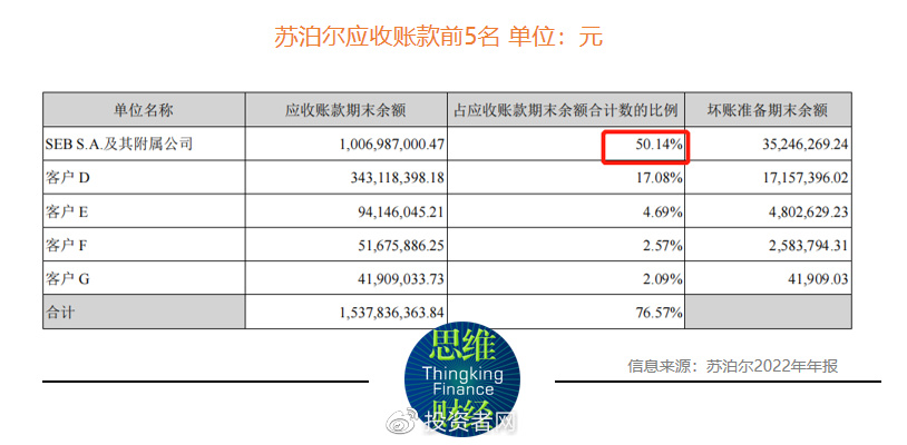 年报显示,SEB集团及其附属公司欠款高达10.07亿元,占苏泊尔总应收账款比例高达50.14%,然而SEB集团及其附属公司2022年销售额占年度总销售的比例为23.18%,两者差距较大(见下表)。