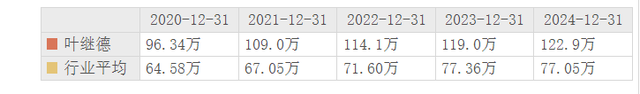 在薪酬方面,叶继德的年薪亦呈稳定增长趋势,从2020年的96.34万元逐步上升至2024年的122.9万元,连续四年涨薪,整体待遇处于行业较好水平。