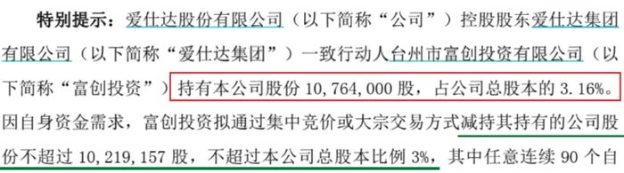 在减持之前,富创投资持有爱仕达1076.4万股,占总股本的3.16%。这也意味着,倘若此次顶格减持,富创投资持有公司的股票不足0.2%,接近清仓。