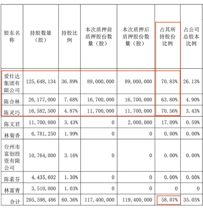 在此之前,爱仕达集团(陈合林家族100%持股)、陈合林、陈合林之女陈灵巧已经累计质押了1.17亿股公司股票,各自质押的股份占所持股份的60%以上。