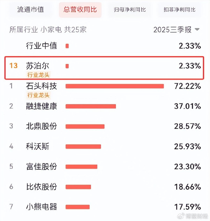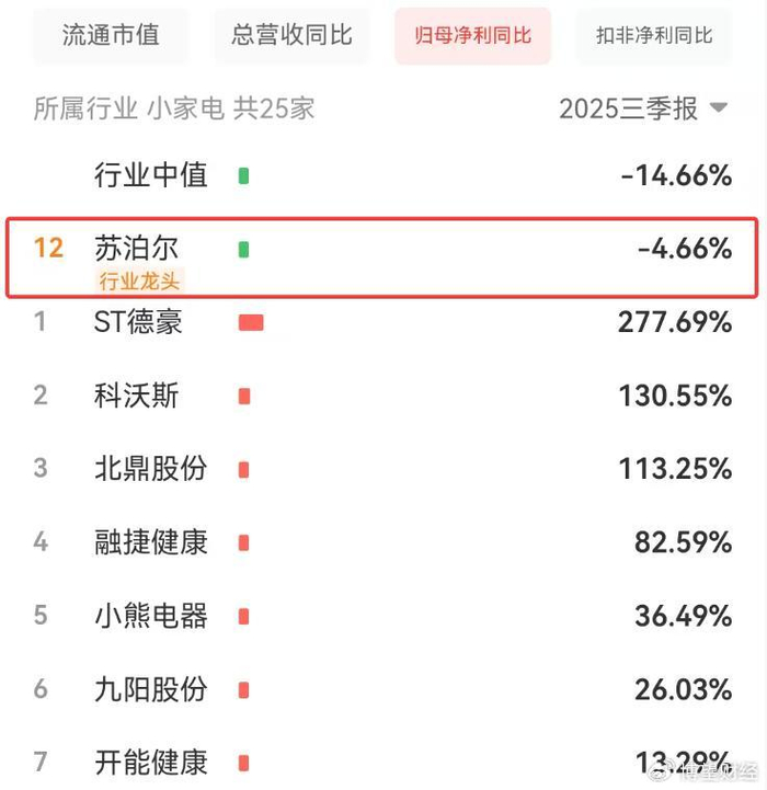 最新的财报显示,苏泊尔正陷入“增收不增利”的境地。2025年前三季度,公司实现营收168.97亿元,同比增长2.33%;净利润为13.66亿元,同比下降4.66%;扣非净利润为13.19亿元,同比下降6.06%。与同行业公司相比,苏泊尔的营收和净利润增速均处于行业于中游水平。
