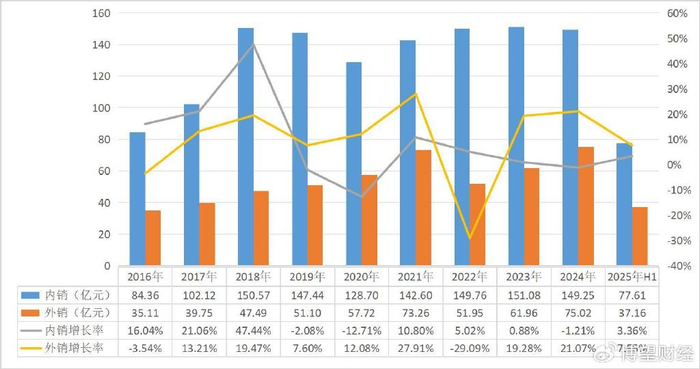 2025年上半年,苏泊尔外销营收达37.16亿元,同比增长7.55%.与2024年21.07%的增速相比,已经出现了较大幅度的下滑。