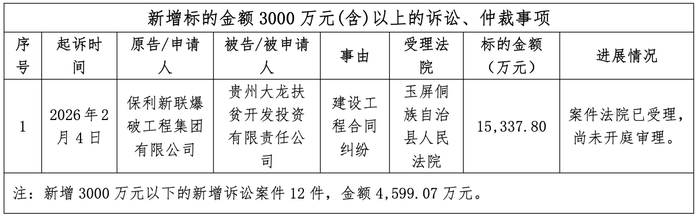 新增的1.53亿元的诉讼案件目前尚未开庭审理,具体影响尚存在不确定性,具体信息如下: