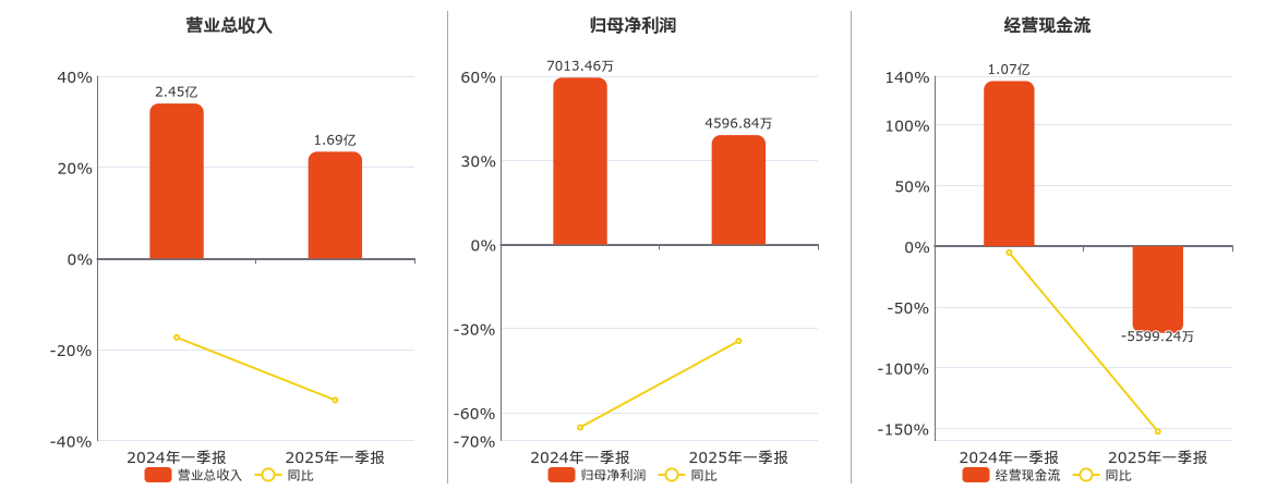 公司营业总收入为1.69亿元,较去年同报告期营业总收入减少7622.01万元,同比较去年同期下降31.10%。归母净利润为4596.84万元,较去年同报告期归母净利润减少2416.62万元,同比较去年同期下降34.46%。经营活动现金净流入为-5599.24万元,较去年同报告期经营活动现金净流入减少1.63亿元,同比较去年同期下降152.45%。