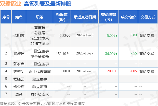 双鹭药业近半年内的董监高及核心技术人员增减持详情如下: