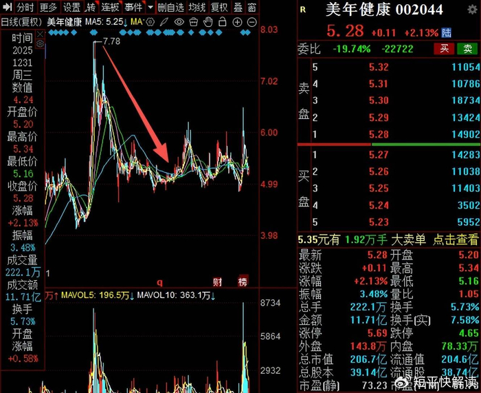 二级市场上,美年健康股价在2025年2月达到7.78元/股(前复权,下同)的高点后,此后股价呈现剧烈波动,总体呈现下滑态势,截至去年12月31日收盘,股价为5.28元/股,较高点跌幅超32%,总市值206.7亿元,TTM市盈率66.78倍,另外,当月17日、18日,股价累计涨幅超20%,公司随即发布股票交易异常波动公告。