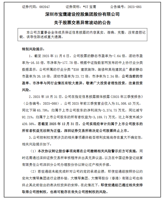 但*ST宝鹰11月7日发布的公告提示称,公司控制权变更涉及的相关事项最终能否顺利实施尚存在重大不确定性。