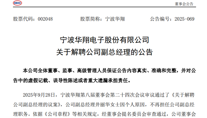 9月28日,宁波华翔发布人事公告称,公司第八届董事会第二十四次会议当日审议通过了《关于解聘公司副总经理的议案》,公司副总经理井丽华因个人原因,不再担任公司副总经理职务。公司董事会同意解聘井丽华担任的副总经理职务,解聘自第八届董事会第二十四次会议审议通过之日起生效。解聘后井丽华的具体工作将由公司另行安排。