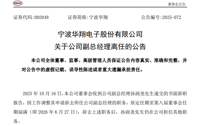 公告显示,宁波华翔董事会于10月16日收到公司副总经理孙润尧的书面辞职报告。因工作调整,孙润尧申请辞去副总经理职务,原定任期至第八届董事会任期届满(即2026年6月27日),辞去该职务后,他仍会在公司担任其他职务。根据《公司章程》等规定,孙润尧的辞职报告自送达董事会之日起生效,其辞职不会影响公司正常生产经营。