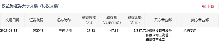 3月11日,宁波华翔大宗交易成交47.33万股,成交额1387.72万元,占当日总成交额的3.19%,成交价29.32元,较市场收盘价29.32元持平。