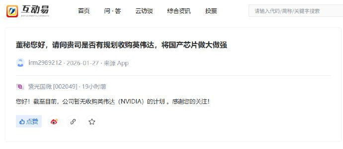 紫光国微:暂无收购英伟达(NVIDIA)的计划