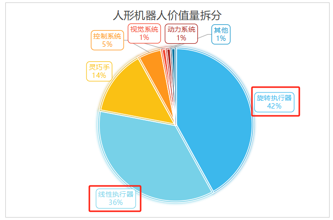 在人形机器人的构成中,执行器是价值量最大的零部件,占比高达78%。其中,线性执行器价值量占比36%,旋转执行器占比42%。