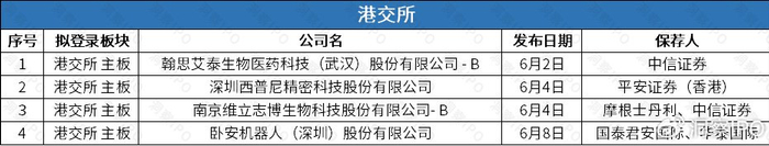 6月2日-6月8日,港交所有4家公司递交主板上市申请。