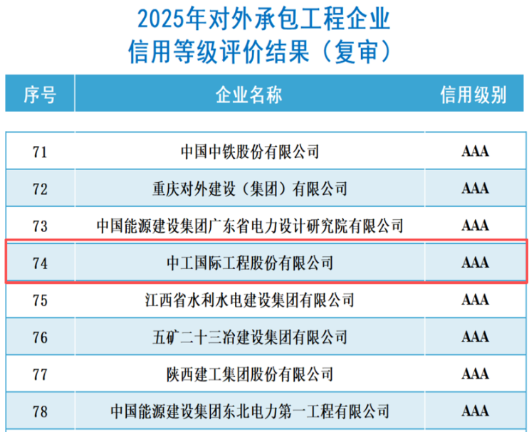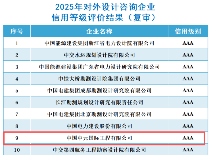 近日,中国对外承包工程商会正式公布2025年度企业信用等级评价结果,中工国际及所属中国中元凭借稳健的经营表现、完善的信用管理体系及卓越的行业口碑,分别获评“对外承包工程企业AAA级信用等级”和“对外设计咨询企业AAA级信用等级”。作为承包商会的理事单位,公司及中国中元连续十余年参与信用评价,始终保持行业最高信用AAA等级,彰显了权威机构对公司综合实力与市场信誉的持续认可。
