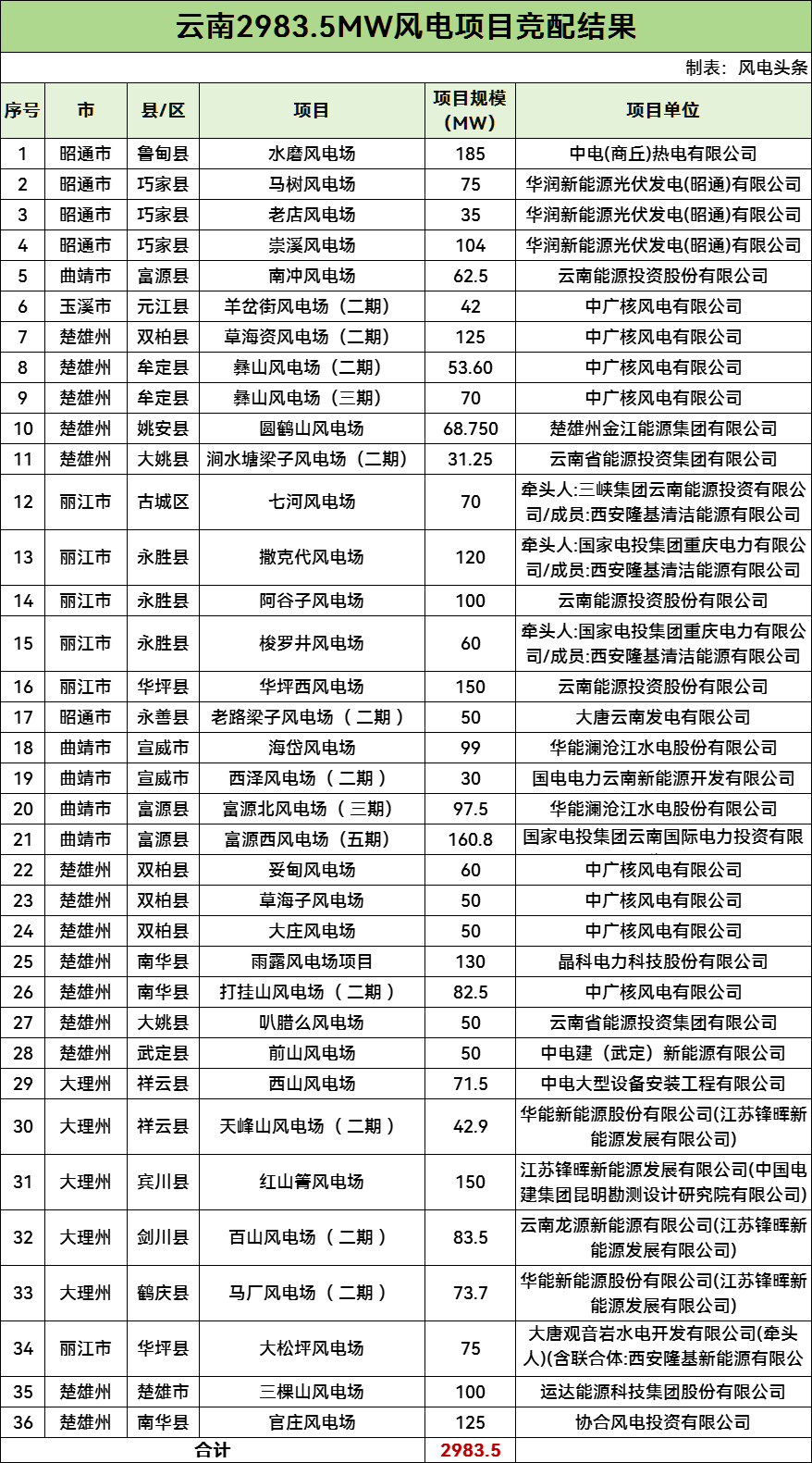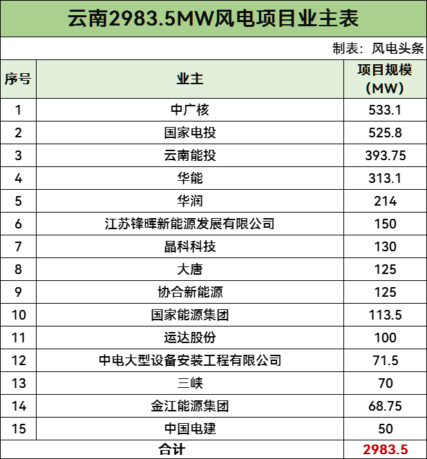 云南2.98GW风电项目业主优选:涉及中广核、国家电投、云南能投、华能等