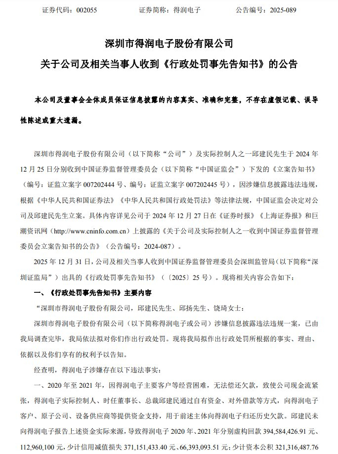 根据安排,得润电子将自1月6日开市起实施其他风险警示,股票简称变更为ST得润,股票交易日涨跌幅限制为5%。公司股票将自2026年1月5日(星期一)开市起停牌1天,自2026年1月6日(星期二)开市起复牌。(证券时报、第一财经)