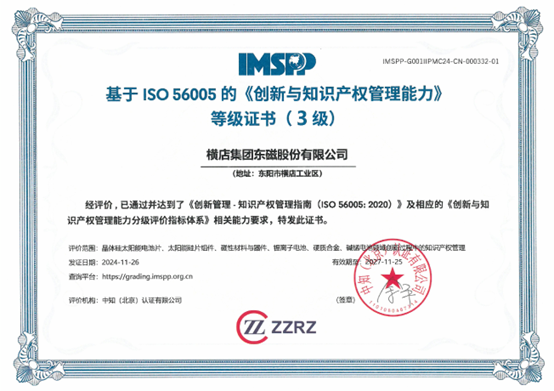 近日,横店集团东磁股份有限公司荣获中知(北京)认证有限公司颁发的ISO 56005国际标准三级证书,成为金华市首家获此证书的企业。