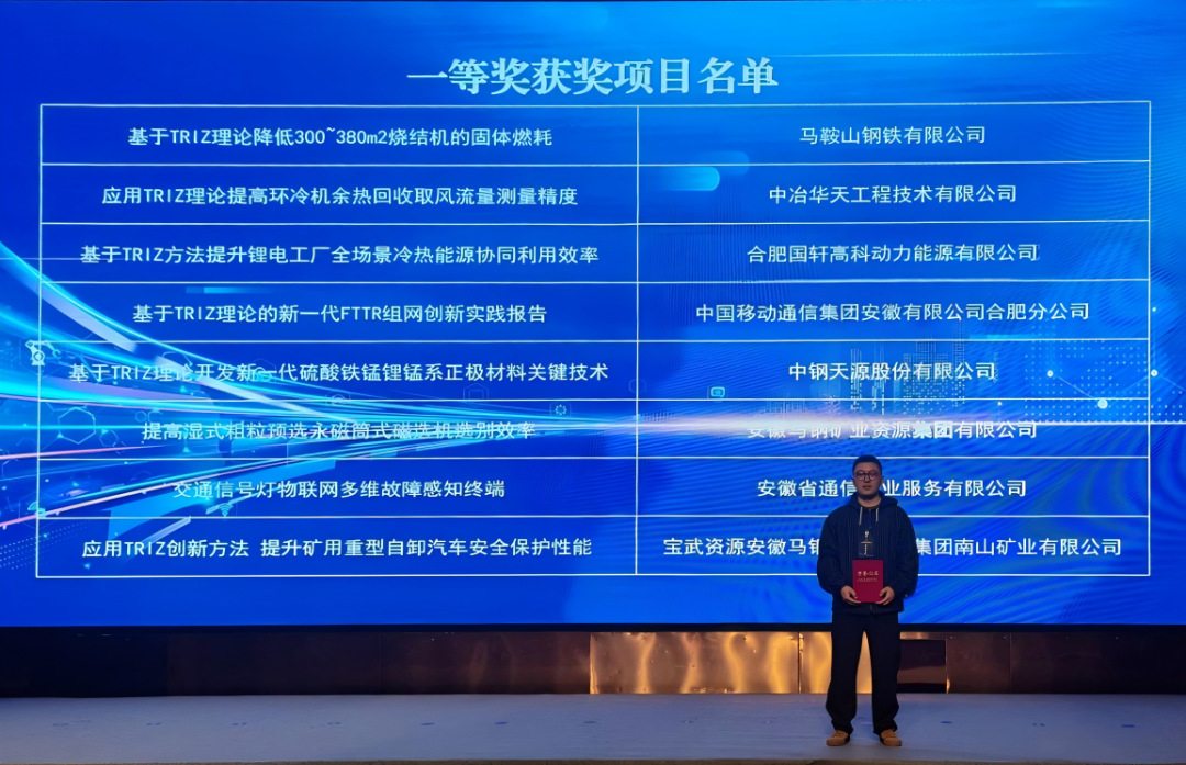 2025年10月24日至26日,由安徽省科学技术协会、省经济和信息化厅、省工商业联合会联合主办的2025年安徽省创新方法大赛决赛在马鞍山市圆满落幕。中钢天源选派的《基于TRIZ理论开发新一代磷酸铁锰锂锰系正极材料关键技术》项目团队,凭借扎实的技术创新、系统的方法应用及出色的现场展示,在激烈竞争中脱颖而出,成功斩获大赛一等奖,为中钢天源科技创新成果再添重要荣誉。