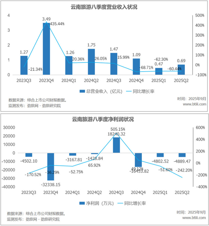 根据报告,云南旅游2025年上半年实现营业收入1.17亿元,同比下降61.22%,归属于上市公司股东的净利润-9691.99万元, 同比下降110.85%;第二季度,实现营业收入0.69亿元,同比下降60.44%。归属于上市公司股东的净利润亏损4889.47万元,同比下降242.20%。