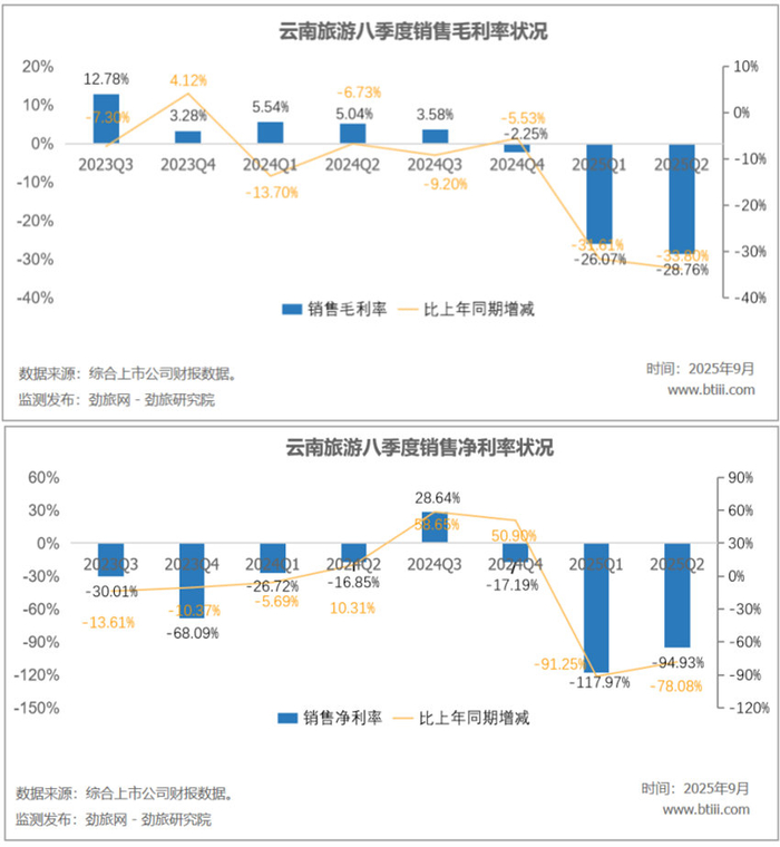 此外,云南旅游销售毛利率为-28.76%,同比上年减少33.80个百分点。销售净利率-94.93%,同比上年减少78.08个百分点。