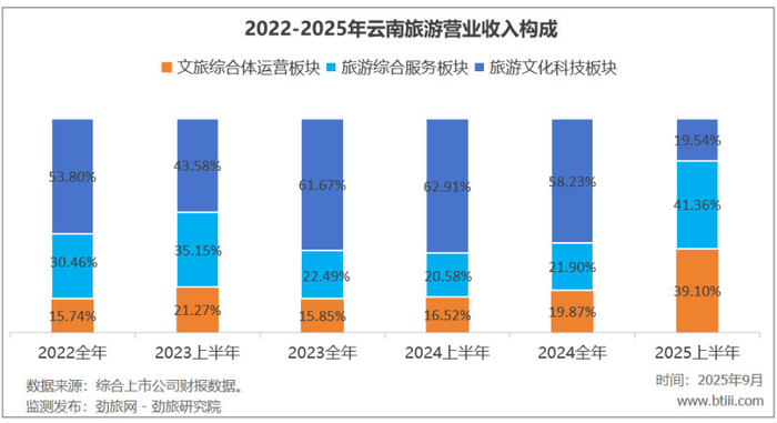 上半年,云南旅游主营业务中,文旅综合体运营板块、旅游综合服务板块、旅游文化科技板块业务营业收入占比分别为39.10%、41.36%、19.54%。