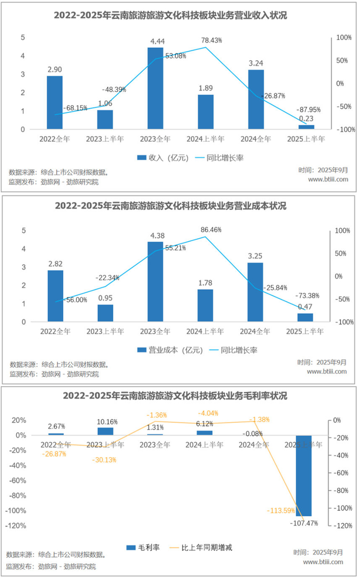 旅游文化科技板块营业收入为0.23亿元,同比下降87.95%。营业成本为0.47亿元,同比下降73.38%。毛利率-107.47%,同比上年减少113.59个百分点。