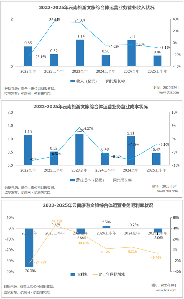 其中,云南旅游文旅综合体运营业务营收收入为0.46亿元,同比下降8.19%。营业成本为0.47亿元,同比下降2.10%。毛利率-3.96%,同比下降6.46个百分点。