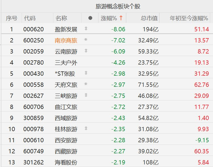 格隆汇11月20日|A股市场旅游股集体下跌,其中,盈新发展跌8%,南京商旅跌7%,云南旅游跌6%,三夫户外跌超4%,天府文旅、三峡旅游、曲江文旅、西域旅游、桂林旅游、西安旅游、西藏旅游、海看股份跌超2%。