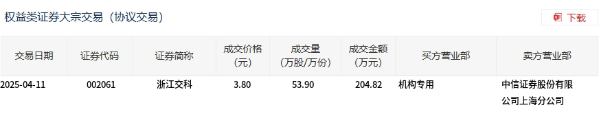 浙江交科今日大宗交易平价成交53.9万股,成交额204.82万元