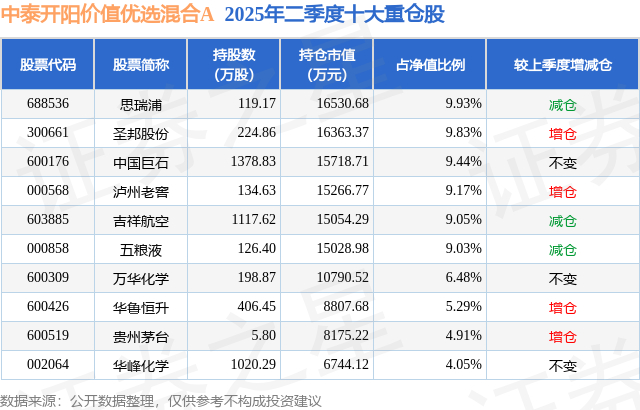 中泰开阳价值优选混合A的前十大重仓股如下:
