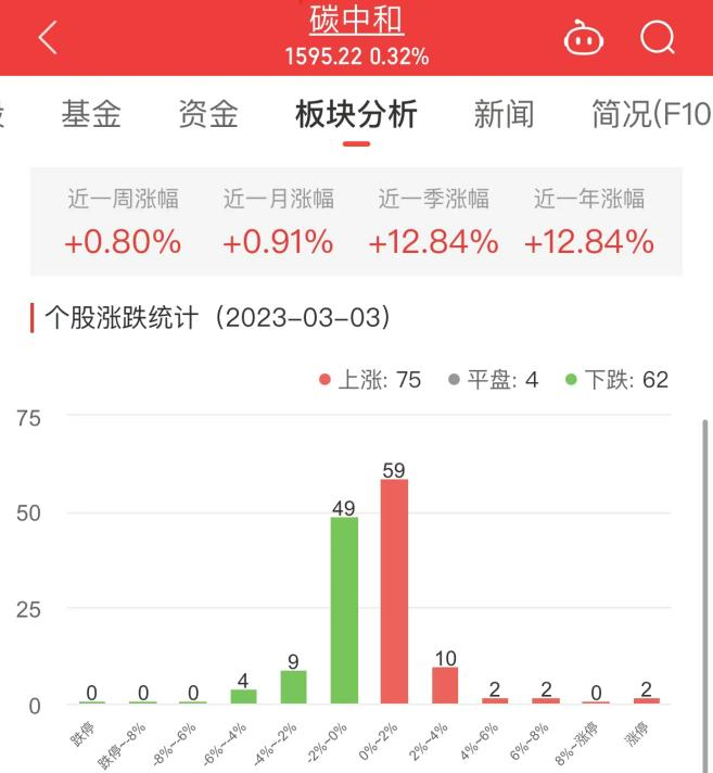 中国经济网北京3月3日讯 今日,碳中和板块整体涨幅0.32%,其中75只股票上涨,4只股票平盘,62只股票下跌。
