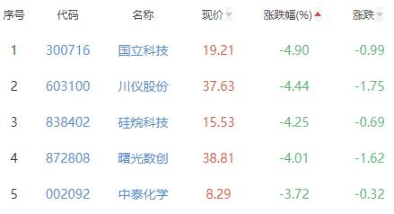 国立科技、川仪股份、硅烷科技、曙光数创、中泰化学位列涨幅榜后五位,涨幅分别为-4.90%、-4.44%、-4.25%、-4.01%和-3.72%。
