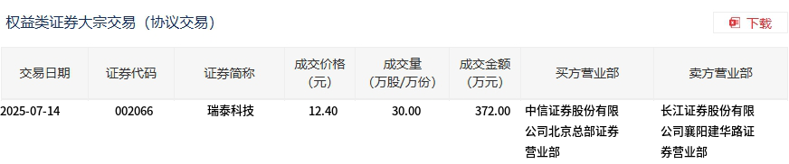 瑞泰科技今日大宗交易折价成交30万股,成交额372万元