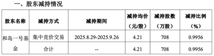 截至公告披露日,上述减持计划期限已届满并已全部实施完毕,和岛一号基金减持公司股份708万股,减持比例0.9956%。减持均价为4.21元/股,据此计算,和岛一号基金减持套现约2980万元。
