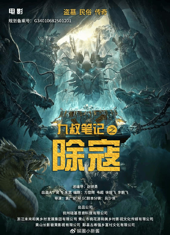 1. 电影《九叔笔记之除寇》:依托“九叔”IP深厚的民俗文化底蕴与受众基础,采用实景还原岭南特色场景,结合AI技术重构经典民俗符号视觉呈现,通过智能特效生成与光影优化,升级悬疑惊悚叙事的沉浸感,实现经典IP的现代化创新。