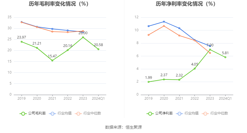 2024年第一季度,公司毛利率为20.58%,同比下降3.01个百分点;净利率为5.81%,较上年同期上升3.09个百分点。