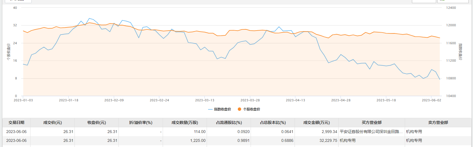 6月6日大宗交易成交1339万股,成交额3.52亿元,占当日总成交额的56.38%,成交价26.31元,较市场收盘价26.31元持平。