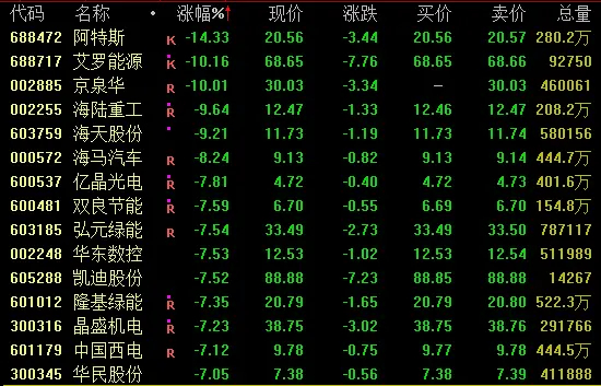 光伏产业链股今日大幅跳水,截至收盘,阿特斯跌超14%,艾罗能源跌超10%,隆基绿能、晶澳科技、通威股份等跌超6%。