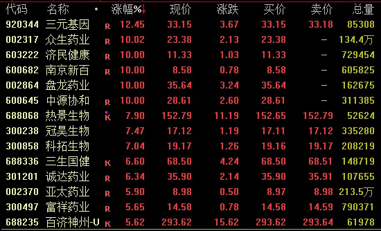 创新药、免疫治疗概念等集体走高,截至收盘,开能健康20%涨停,三元基因涨超12%,济民健康、盘龙药业、中源协和等涨停,冠昊生物、热景生物涨超7%,百济神州等涨超5%。
