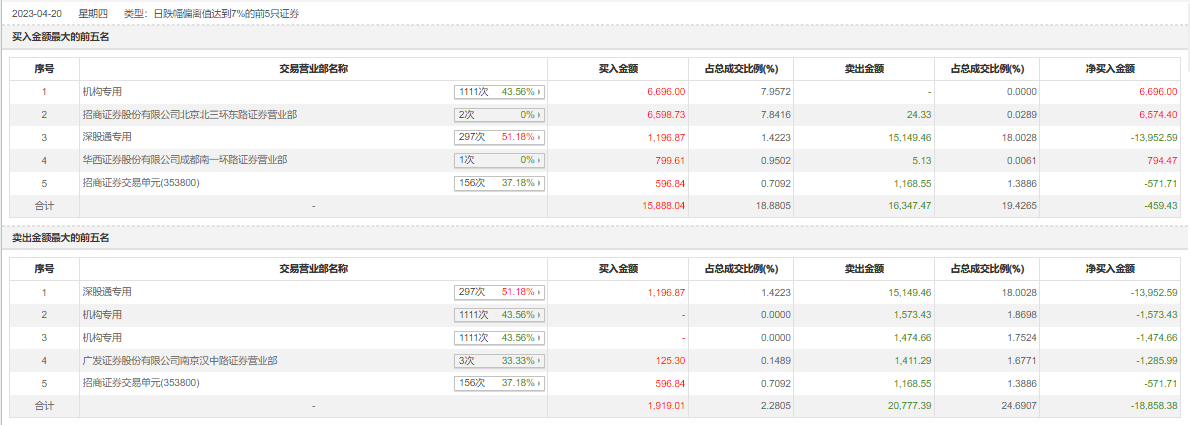 4月20日,中材科技今日跌停,龙虎榜数据显示,上榜营业部席位全天成交3.68亿元,占当日总成交金额比例为43.75%。其中,买入金额为1.6亿元,卖出金额为2.08亿元,合计净卖出4793.51万元。具体来看,机构买入6696.0万元,卖出3048.09万元,合计净买入3647.91万元。此外,深股通专用、广发证券南京汉中路证券营业部分别卖出1.51亿元、1411.29万元;招商证券北京北三环东路证券营业部、深股通专用分别买入6598.73万元、1196.87万元。