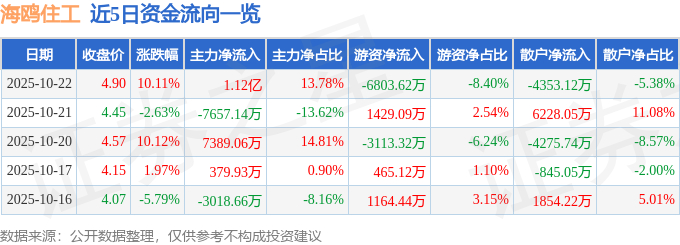 证券之星消息,海鸥住工10月22日涨停收盘,收盘价4.9元。该股于11点23分涨停,3次打开涨停,截止收盘封单资金为1101.23万元,占其流通市值0.35%。