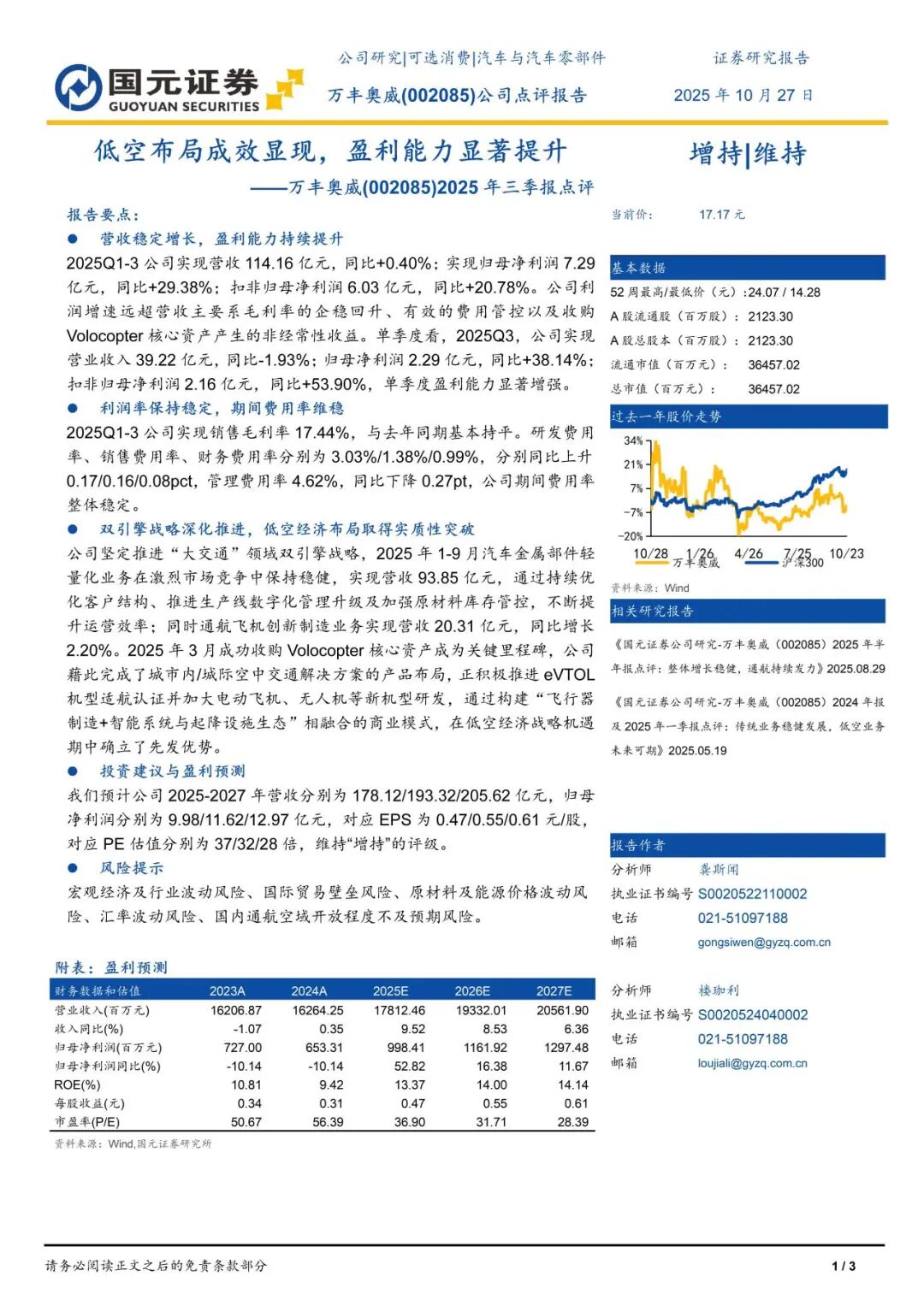 本报告摘自国元证券2025年10月27日已发布的《低空布局成效显现,盈利能力显著提升——万丰奥威(002085)2025年三季报点评》,具体报告及分析内容请详见报告。若因对报告的摘编等产生歧义,应以报告发布当日的完整内容为准。
