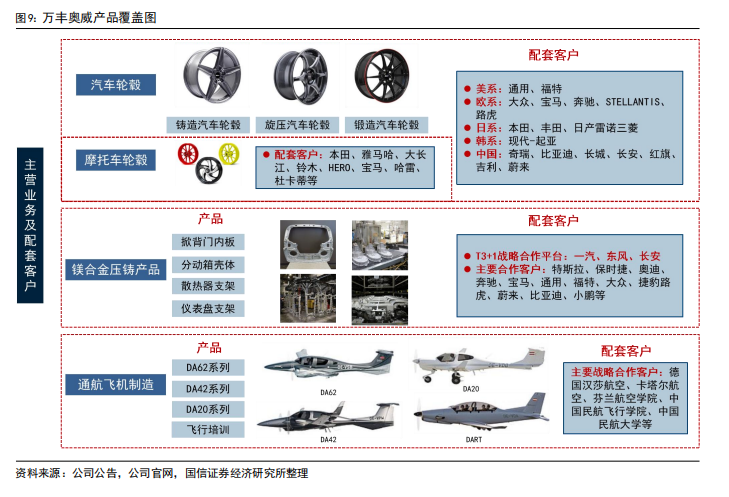公司金属部件轻量化产品聚焦铝/镁合金,主要产品为铝合金轮毂和轻量化镁合金部件,主要服务于国际知名汽车主机厂,新能源汽车以及部分航空航天、高铁、5G 等行业客户,构建了以美系、欧系、日系、韩系、国内知名主机厂以及主流新能源客户为核心的全球客户布局。